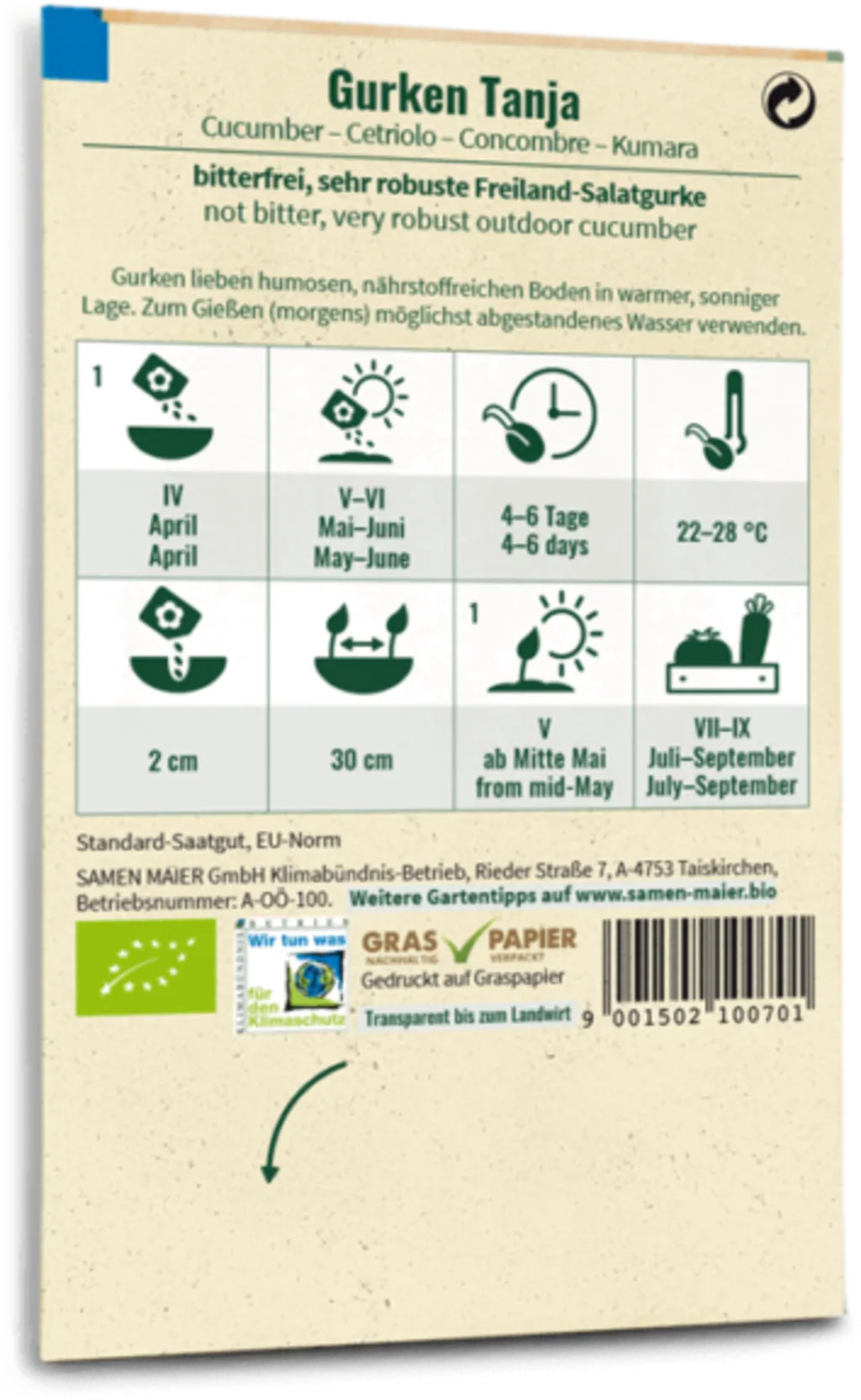 Diese sehr robuste Freiland-Gurke begeistert mit ihrem bitterfreien Geschmack, mit dem sie die perfekte Zutat zu köstlich-frischen Sommersalaten ist. Sie bevorzugt einen lockeren, humosen Boden sowie einen sonnigen Standort und sollte keinesfalls pikiert und auch nicht zu früh in Töpfen ausgesät werden. Am besten wird sie nach den Eisheiligen und wenn sich zwei echte Blätter gebildet haben ausgepflanzt.