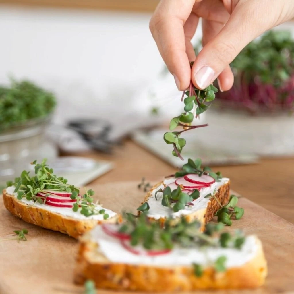 Gartenkresse, Alfalfa Sprossen, Weißer Senf, Daikon Rettich, Rucola, Brokkoletti (Ur-Brokkoli), Japanischer Senfkohl (Mizuna Red), Radies (China Rose)