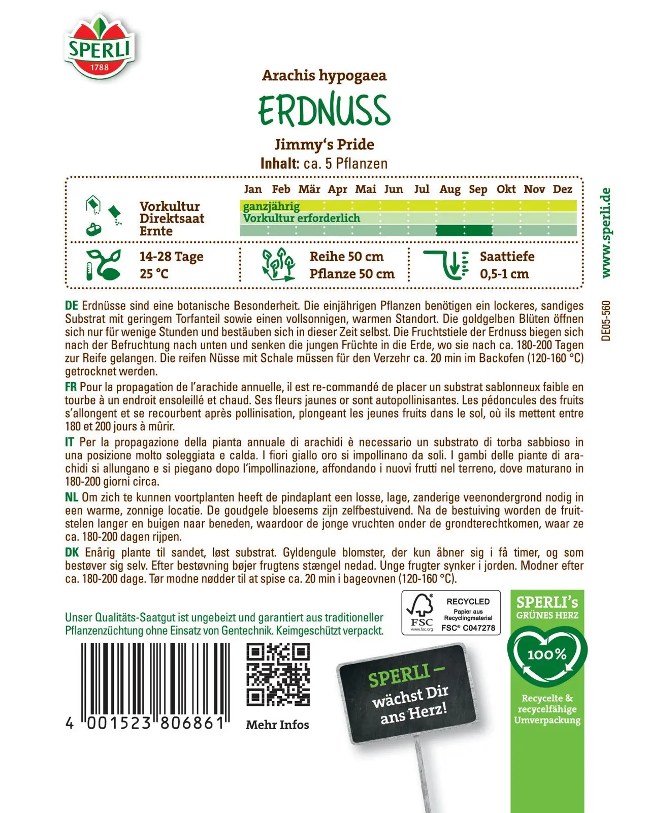 Erdnüsse sind eine botanische Besonderheit. Nachdem die gelben Blüten befruchtet wurden, bohrt sich die junge Frucht in den Boden und entwickeln sich dort. Die Blüten sind goldgelb, öffnen sich nur für wenige Stunden und bestäuben sich in dieser Zeit selbst. Die Erdnüsse können nach einer Kulturzeit von etwa 180 bis 200 Tagen geerntet werden.