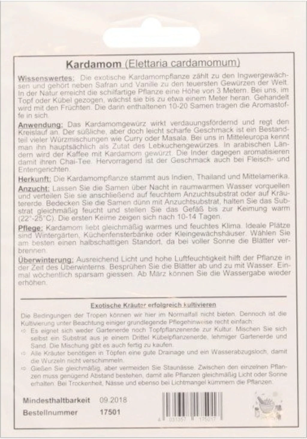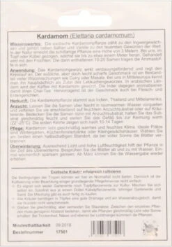 Die exotische Kardamompflanze zählt zu den Ingwergewächsen und gehört neben Safran und Vanille zu den teuersten Gewürzen der Welt. In der Natur erreicht die schilfartige Pflanze eine Höhe von 3 Metern. Bei uns, im Topf oder Kübel gezogen, wächst sie bis zu etwa einem Meter heran. Gehandelt wird mit den Früchten. Die darin enthaltenen 1 -2 Samen tragen die Aromastoffe in sich.