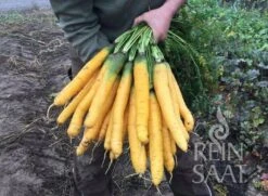 Die leuchtend gelbe, glattschalige Karotte wird bis zu 20 – 25 cm lang mit abgerundeter Spitze und kräftigem Laub.