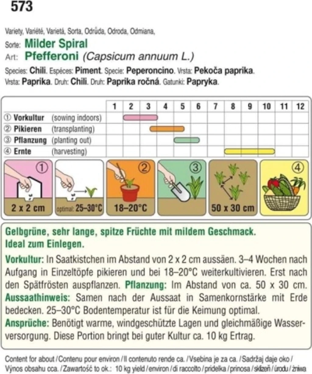 Die Sorte “Milder Spiral” bildet sehr lange, gelbgrüne und spitze Früchte. An warmen Standorten kann mit früher Ernte gerechnet werden. Perfekt zum Einlegen oder kann auch frisch wie Paprika gegessen werden.