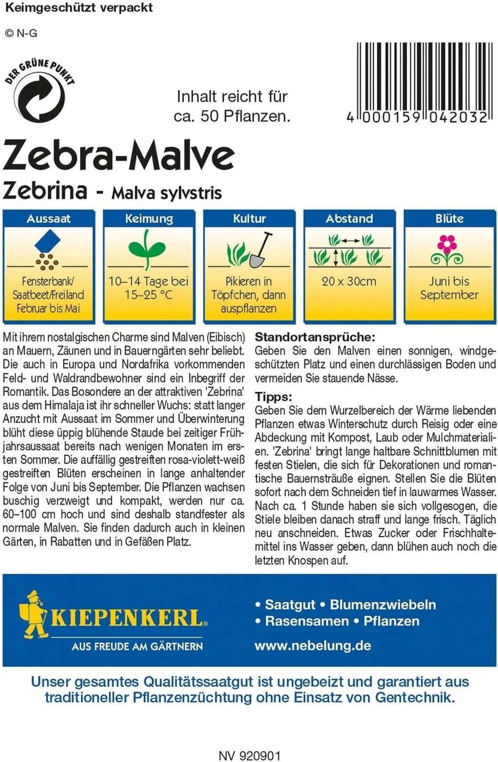 Mit ihrem nostalgischen Charme sind Malven (Eibisch) an Mauern, Zäunen und in Bauerngärten sehr beliebt. Die auch in Europa und Nordafrika vorkommenden Feld- und Waldrandbewohner sind ein Inbegriff der Romantik. Das Besondere an der attraktiven ‚Zebrina‘ aus dem Himalaya ist ihr schneller Wuchs: statt langer Anzucht mit Aussaat im Sommer und Überwinterung blüht diese üppig blühende Staude bei zeitiger Frühjahrsaussaat bereits nach wenigen Monaten im ersten Sommer. Die auffällig gestreiften rosa-violett-weiß gestreiften Blüten erscheinen in lange anhaltender Folge von Juli bis September. Die Pflanzen wachsen buschig verzweigt und kompakt, werden nur ca. 60 – 100 cm hoch und sind deshalb standfester als normale Malven. Sie finden dadurch auch in kleinen Gärten, in Rabatten und in Gefäßen Platz.